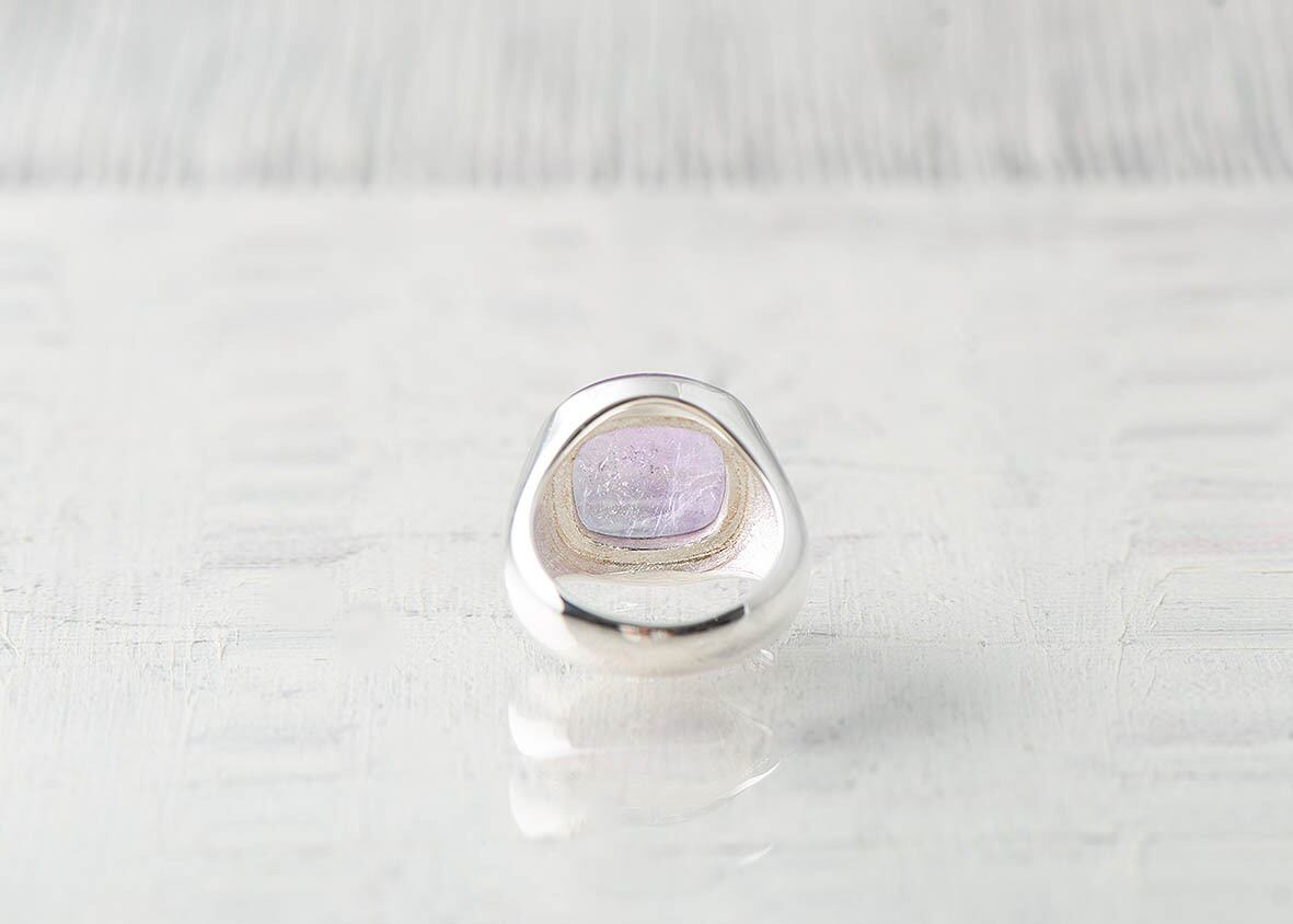 クッションカットのアメジストは、みずみずしくやさしい雰囲気。
