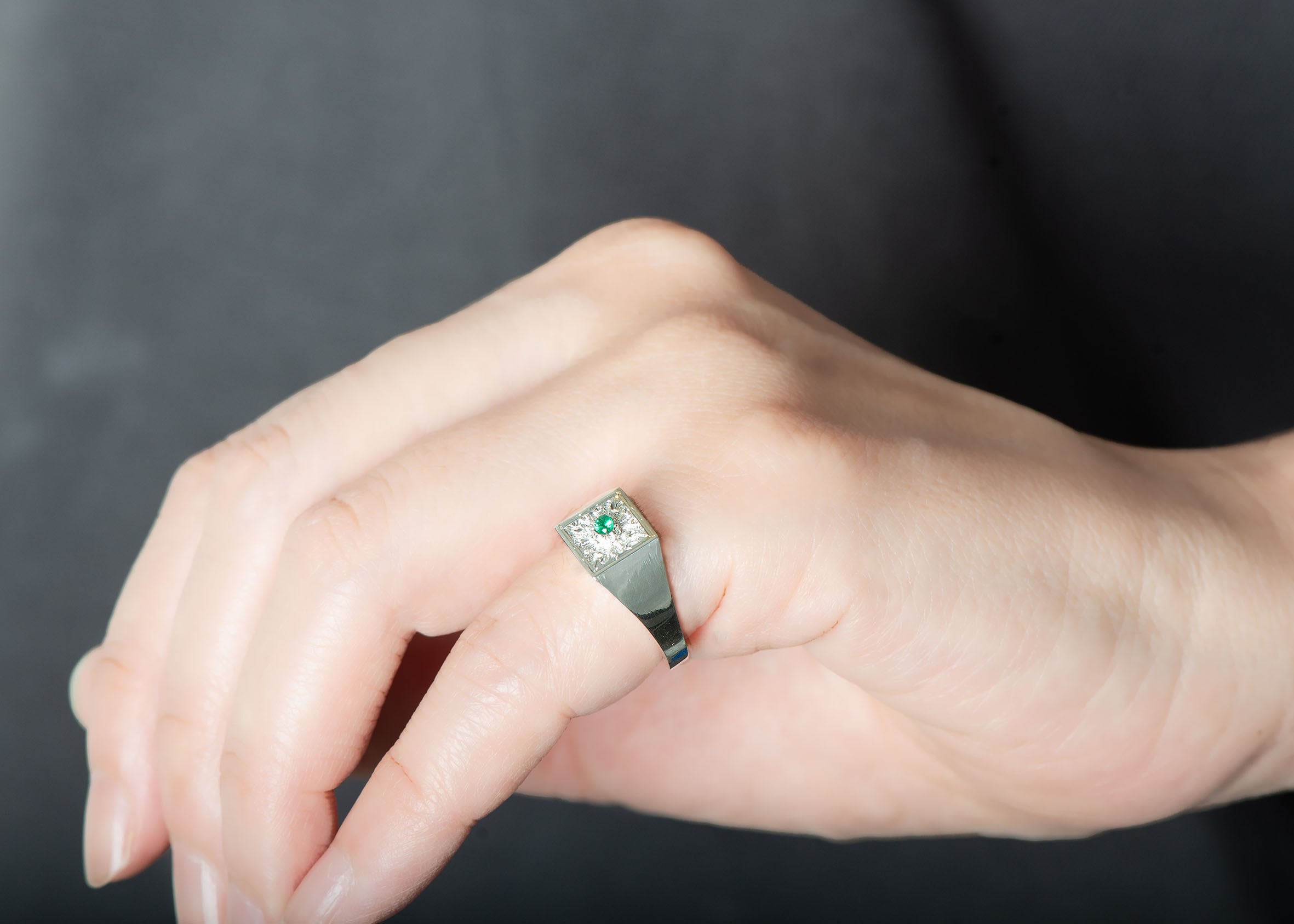 リングの天面には、La Filosofia di Yasushi Sekineによる深彫りのハンドエングレービングが丁寧に施されており、クラフトマンシップが光る仕上がり。