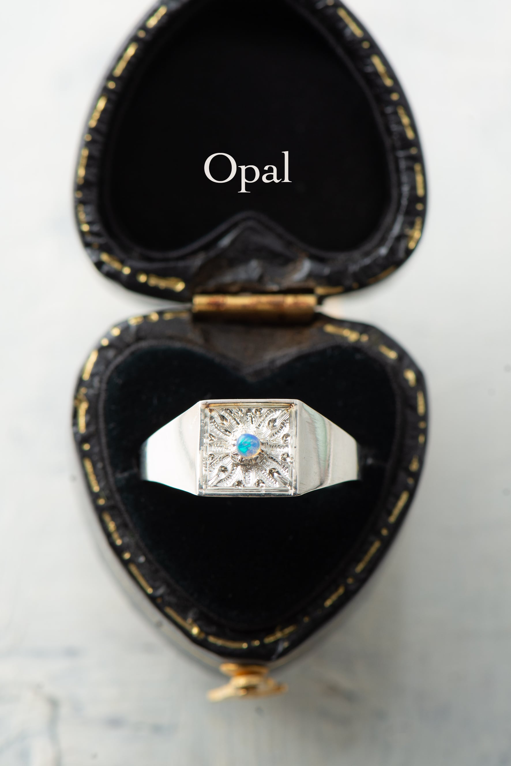 凛とした透明感と爽やかなブルーが魅力。シャープな印台のデザインに清らかな印象を添えます。