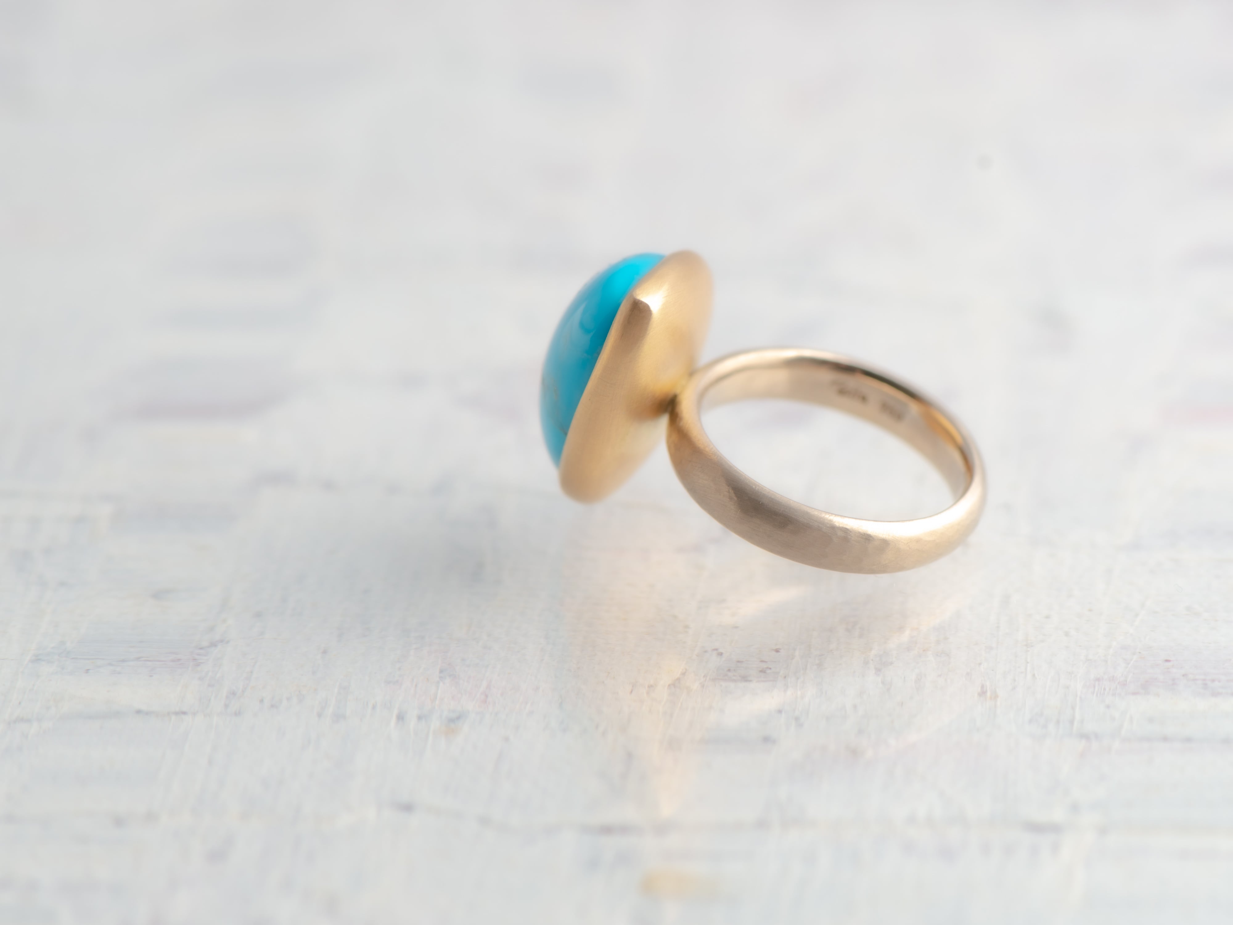 おおきな雫型のターコイズを、K18イエローゴールドとハニーゴールドのコンビで仕上げたボリュームリング。